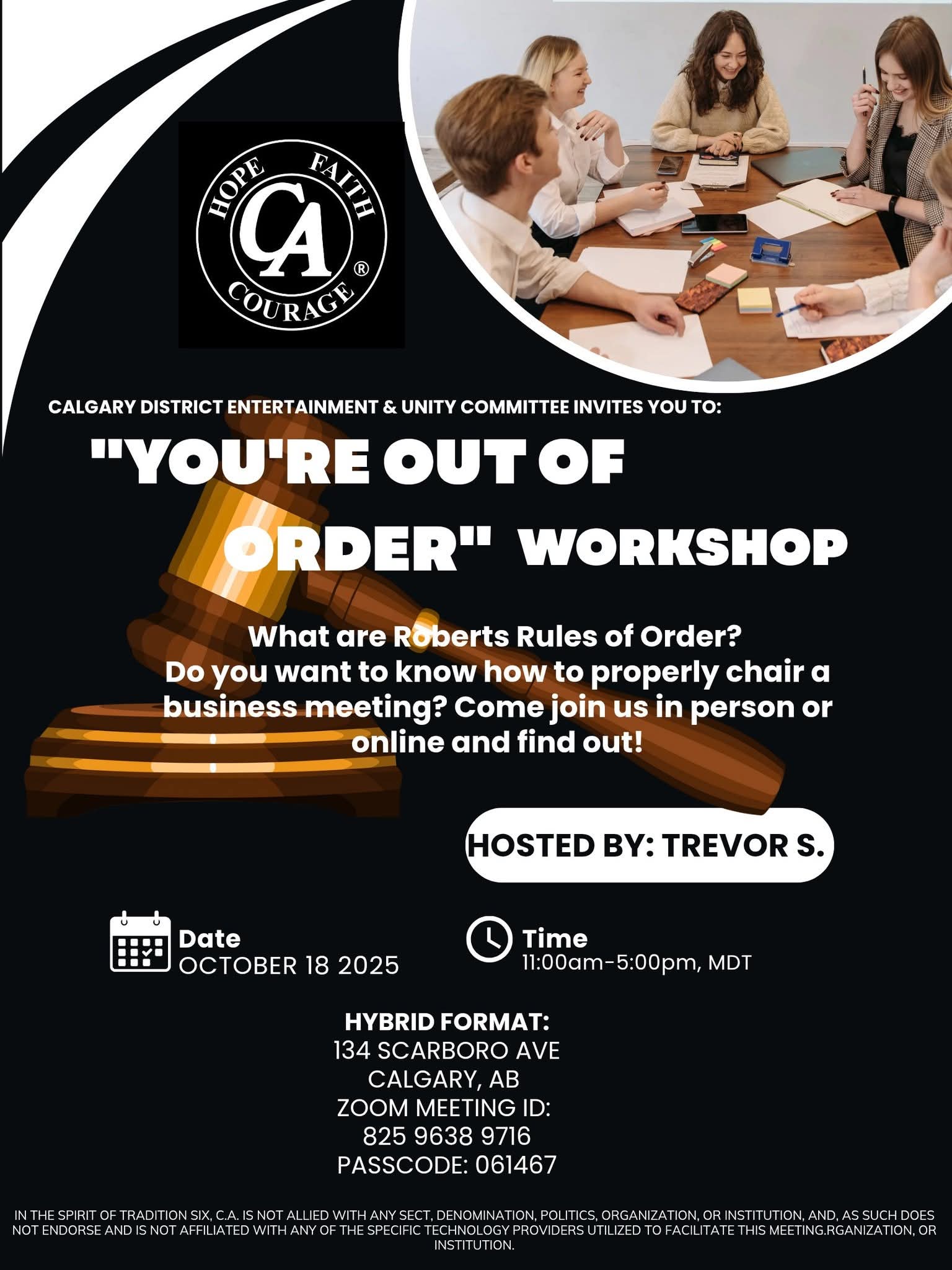 Certain information listed herein about the local event, the event location, event activities, and even the host city is included for informational purposes only; so that those attending the event looking for something to do during the event might have that information. The listing of such information here does not, nor should it imply affiliation, cooperation or endorsement of such venues, hotels, or activities by C.A. or by C.A. World Services. If you have further questions or concerns on this matter, please contact the Event Chair. To have a C.A. related event poster on this page send an email to sabaca.it@gmail.com